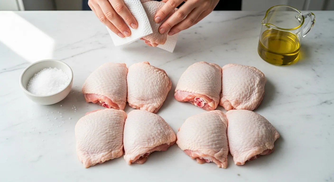 Remove chicken thighs from the refrigerator 20 minutes before cooking. Pat every surface completely dry with paper towels — top, bottom, and in the crevices. Any moisture on the skin surface will create steam in the oven and prevent crisping.