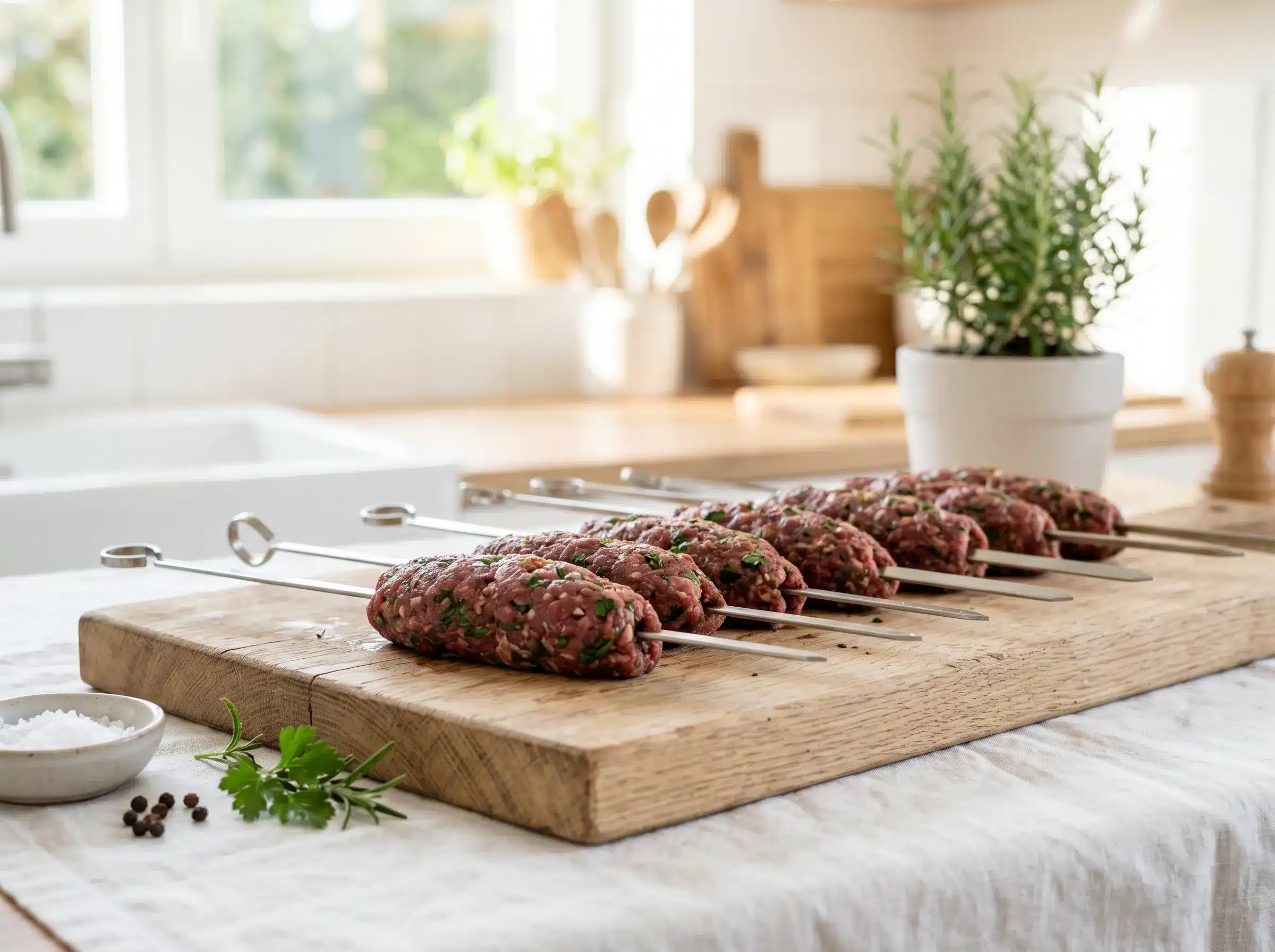Ground Beef: 80/20 fat ratio is the correct choice for kofta. Enough fat to keep the skewers moist and cohesive without making them greasy. Leaner beef dries out completely and crumbles off the skewer. Do not use extra-lean beef.