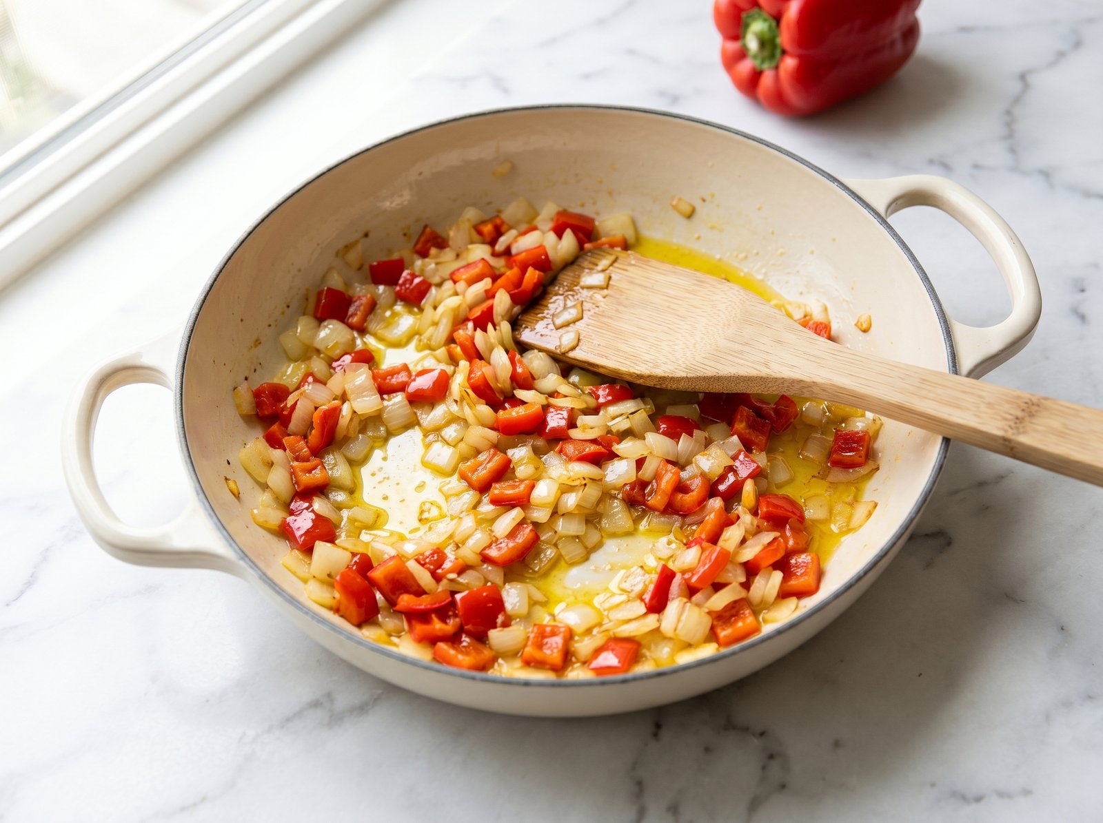 Heat olive oil in a large, deep skillet or cast iron pan over medium heat. Add diced onion and red bell pepper. Cook for 6 to 7 minutes, stirring occasionally, until completely softened and the onion begins to turn lightly golden. Do not rush this step — it builds the sweet, savory foundation of the sauce.