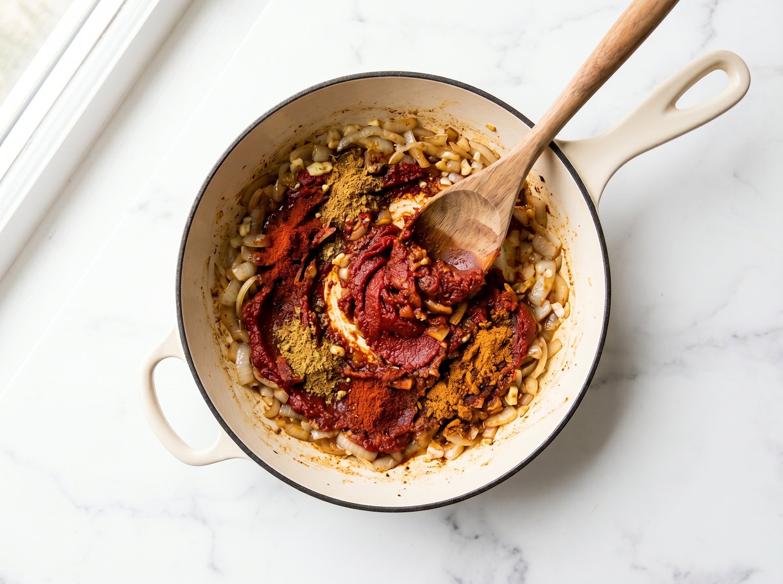 Step 2 — Add Garlic, Spices, and Tomato Paste (2 min)