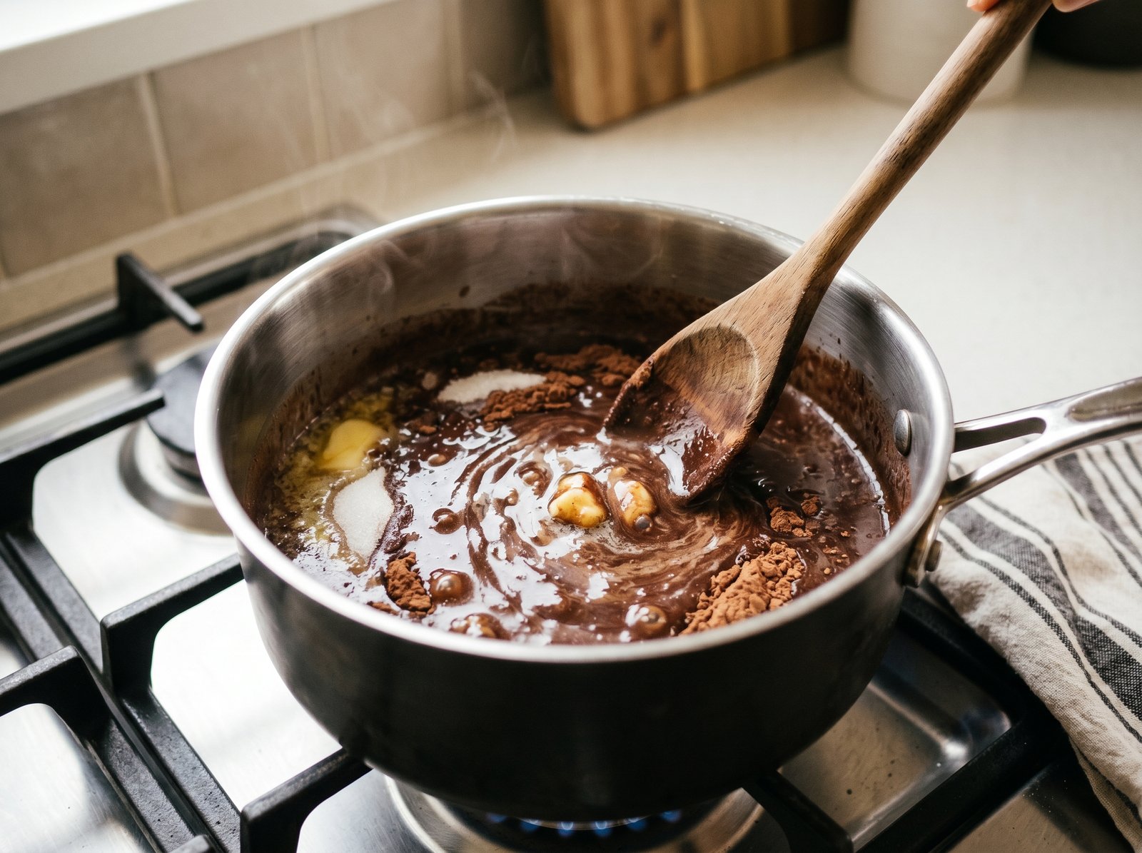 In a medium, heavy-bottomed saucepan combine butter, sugar, milk, sifted cocoa powder, and salt. Cook over medium heat, stirring constantly, until the butter melts and the sugar begins to dissolve. Continue stirring until the mixture is completely smooth, glossy, and uniform with no streaks of cocoa.