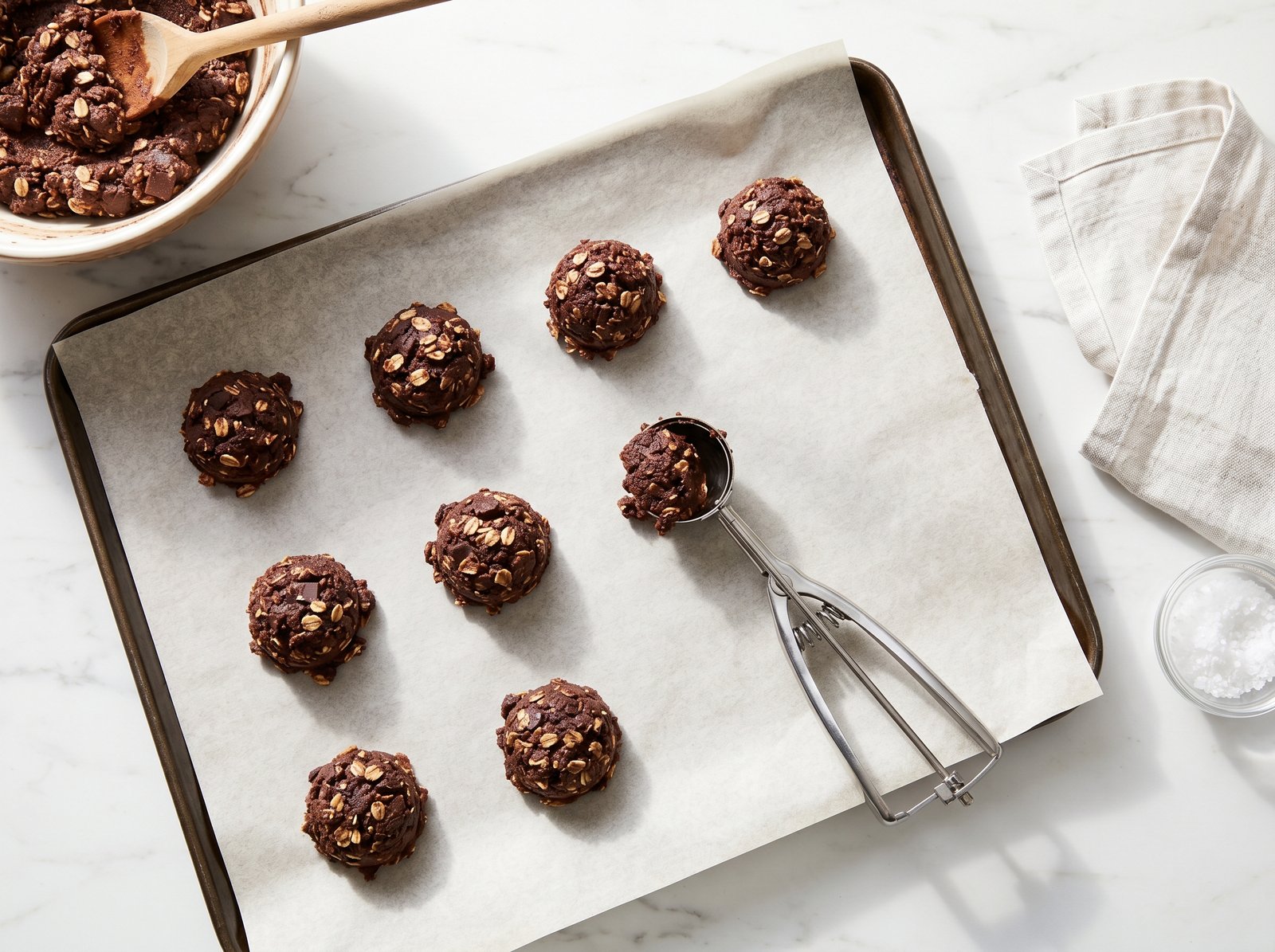 Drop rounded spoonfuls onto the prepared parchment-lined baking sheet. A cookie scoop or two heaping tablespoons per cookie gives uniform size. Work quickly as the mixture continues to firm up. Slightly rough cookies are fine — they smooth out as they cool.