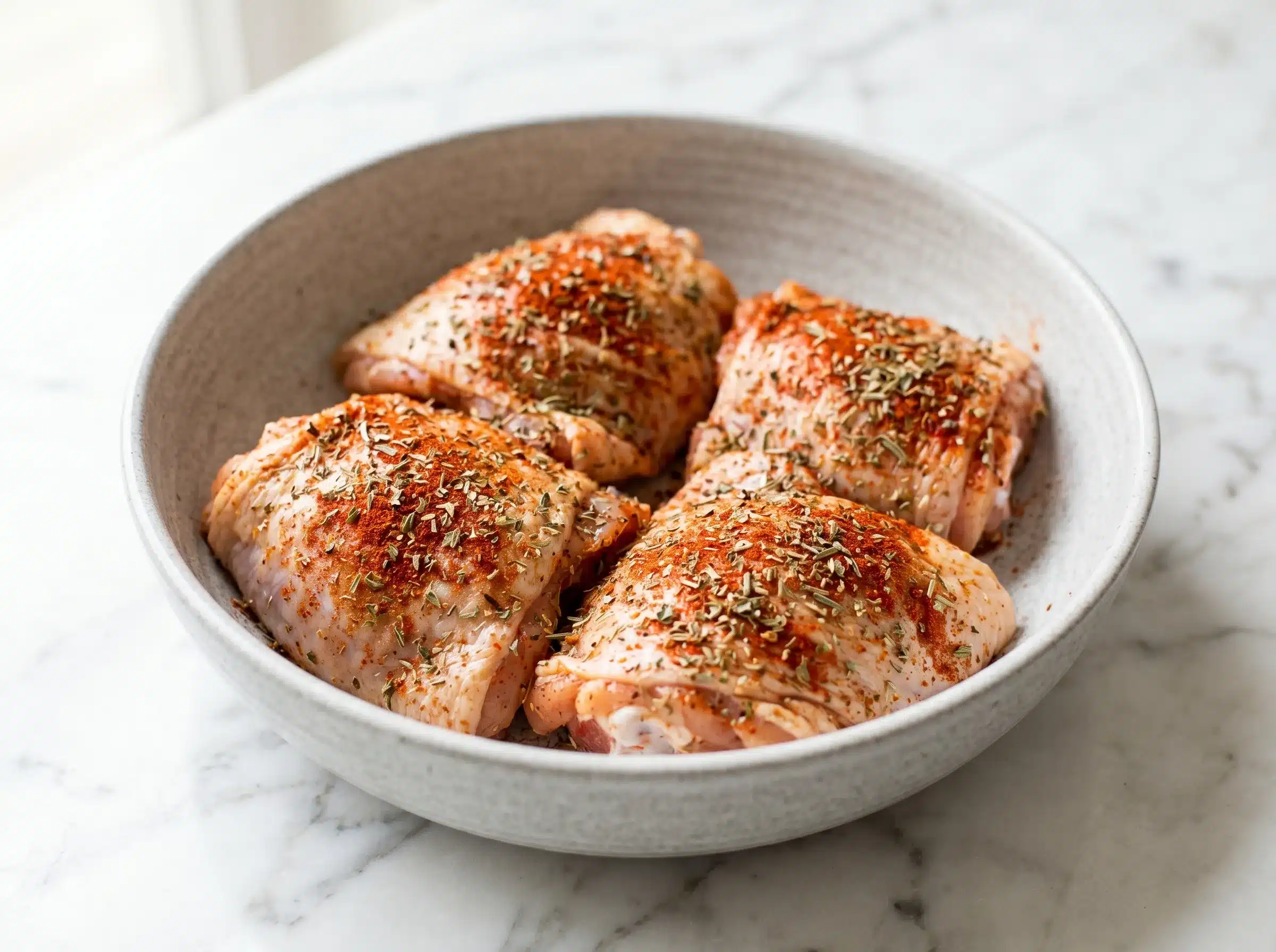 Pat chicken thighs completely dry with paper towels. Moisture is the enemy of a good sear — do not skip this step. Season both sides generously with smoked paprika, Italian seasoning, garlic powder, salt, and black pepper. Press the seasoning gently into the meat so it adheres well and does not fall off during cooking.