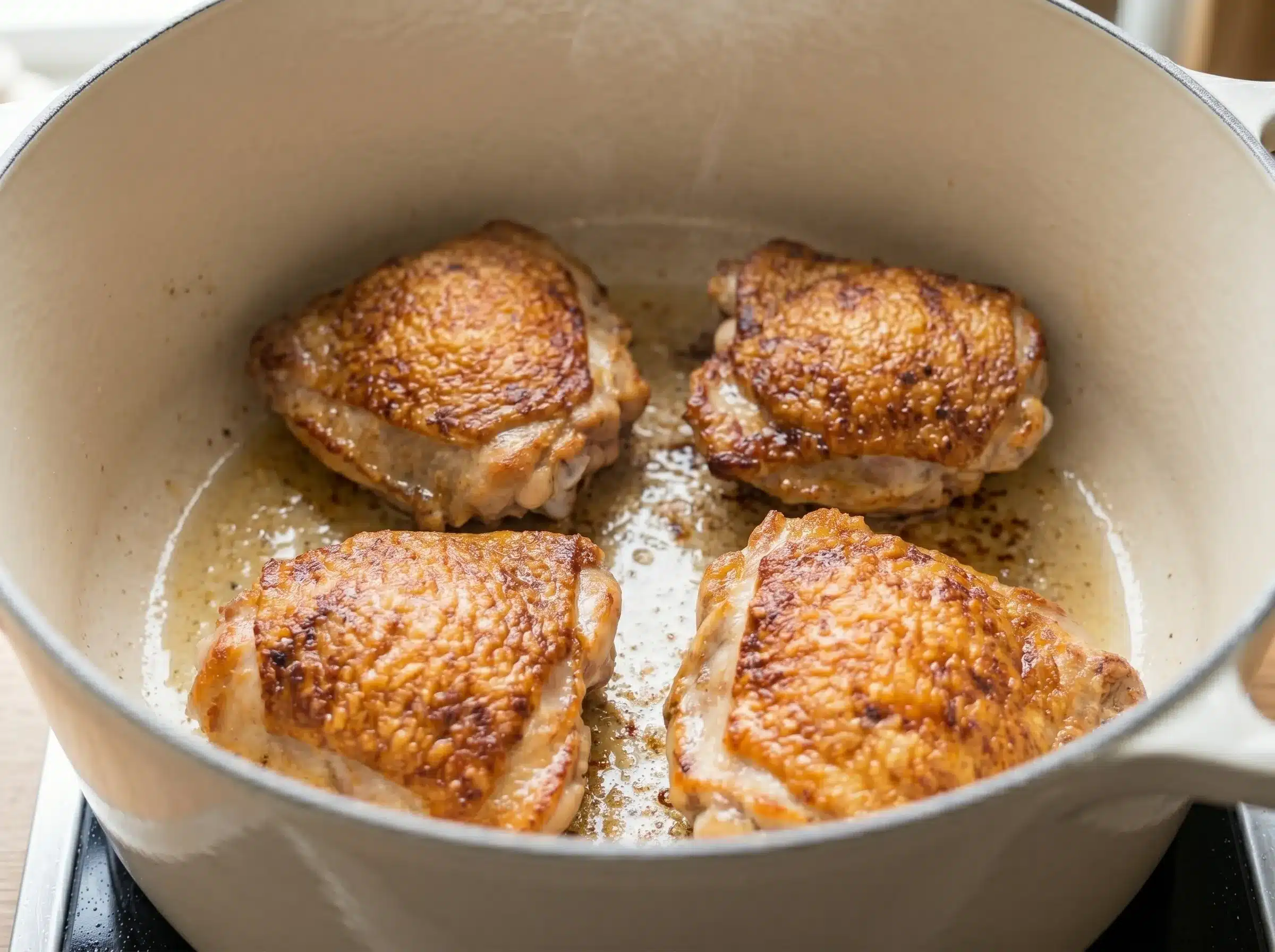 Heat olive oil in a large heavy-bottomed pot or Dutch oven over medium-high heat until shimmering. Add chicken thighs skin-side down and cook undisturbed for 4 to 5 minutes until deeply golden and releasing cleanly from the pan. Flip and sear the other side for 2 minutes. Remove chicken to a plate. Do not clean the pot — those drippings are pure flavor.
