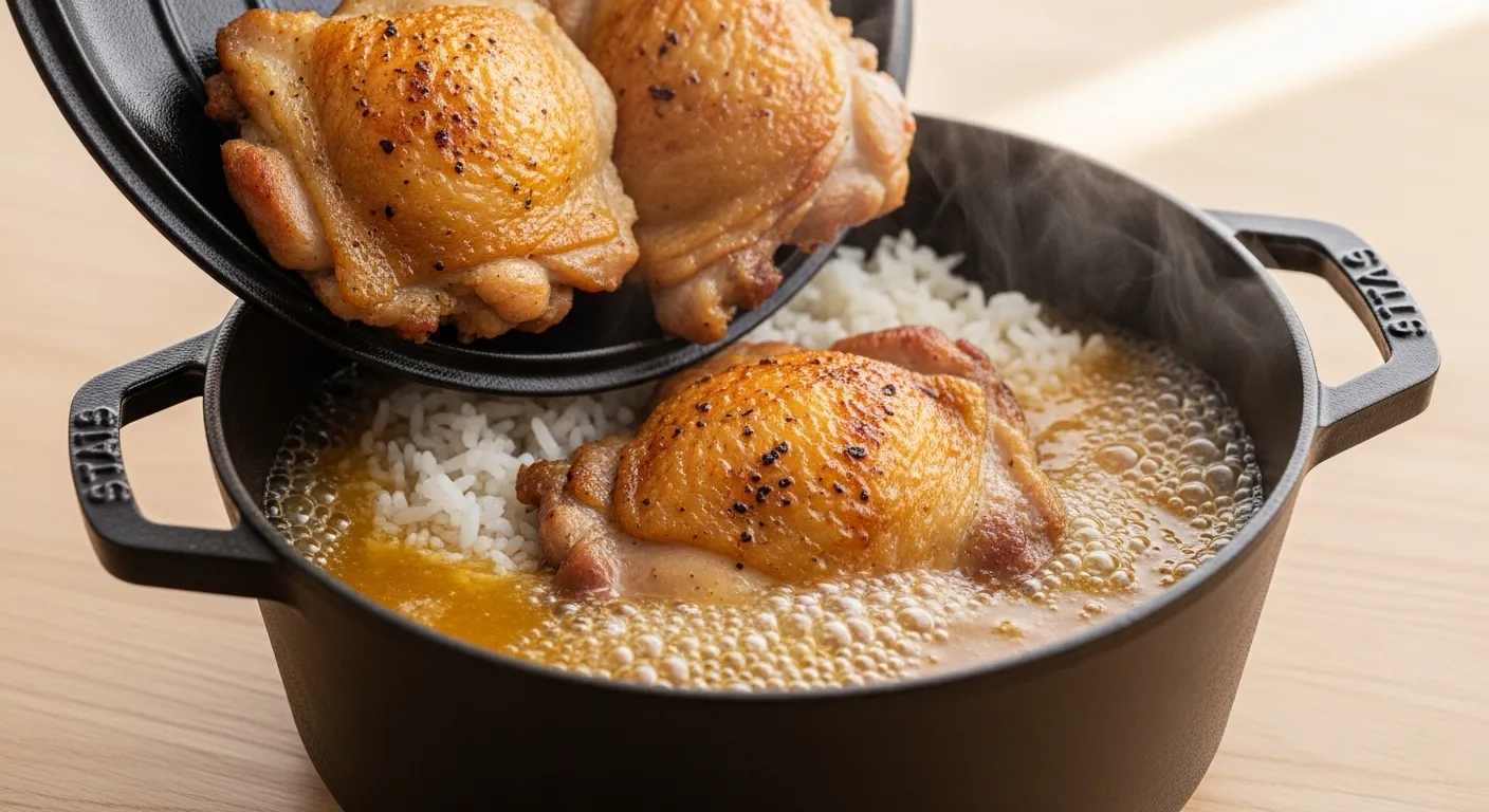 Pour in chicken broth and stir to combine everything evenly. Taste the liquid and adjust salt if needed. Nestle the seared chicken thighs on top of the rice, skin-side up, including any resting juices from the plate. Bring to a gentle boil, then reduce heat to low. Cover tightly and cook for 18 to 20 minutes without lifting the lid.