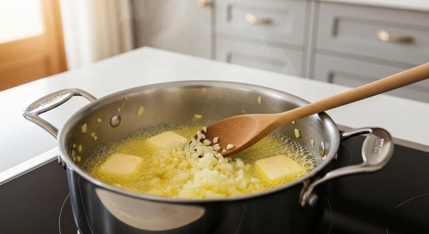 Reduce heat to medium. Add butter to the same pot and let it melt until foaming. Add diced onion and cook for 3 minutes, stirring occasionally, until translucent and soft. Add minced garlic and stir constantly for 1 minute until fragrant. Do not let it brown or it will turn bitter.